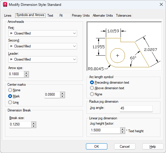 Controls the appearance of center marks and centerlines for diameter and radial dimensions.