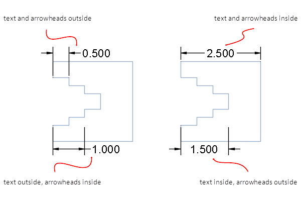 Dimension text and arrowheads usually appear between the extension lines when there is enough space. You can specify how these elements are placed when space is limited.