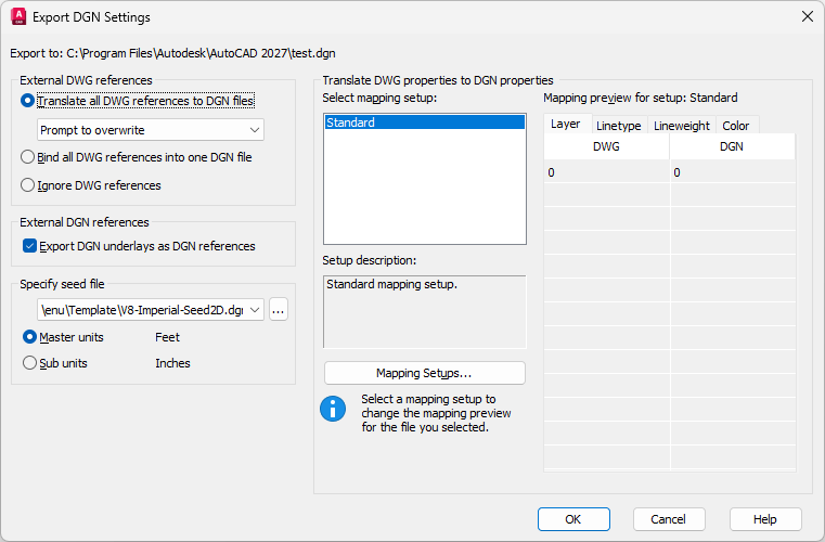 A seed file for a DGN file is similar to a drawing template (DWT) file that contains default settings and attributes, such as working units. Selecting the appropriate DGN seed file (imperial, metric, or user-defined), and conversion units is critical to the translation from DWG to DGN. In addition, the seed file contains settings that are not present in a DWG file, and therefore inherited in the exported DGN.