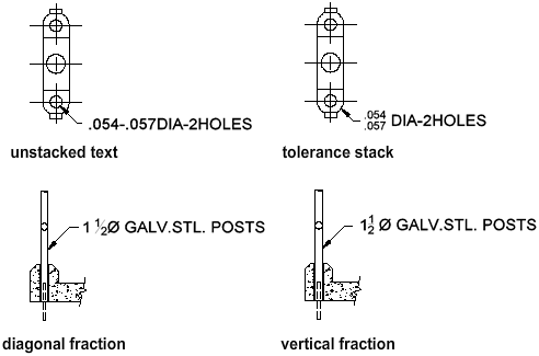 Stacked text refers to the fraction and tolerance formats applied to characters within multiline text objects and multileaders. Characters representing fractions and tolerances can be formatted to conform to several standards.