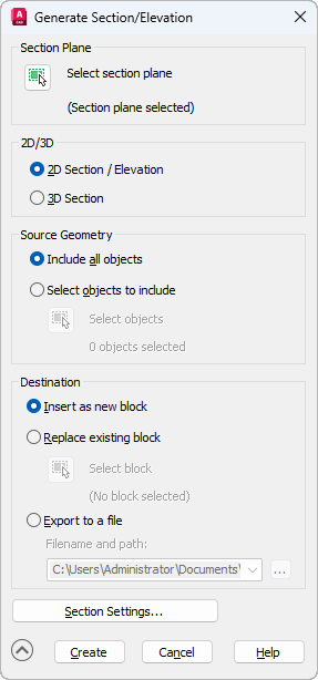 Closes the dialog box so that you can select a section plane to modify or save as a block.