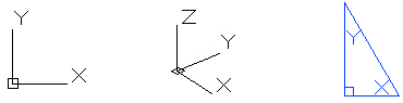 The following examples display two 3D UCS icons viewed in model space and a UCS icon viewed in a paper space layout.