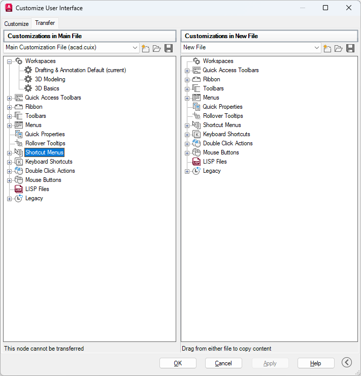 When you enter CUIIMPORT at the Command prompt, the main CUIx file is displayed in the right pane (acad.cuix for AutoCAD files or acadlt.cuix for AutoCAD LT files by default). You open a CUIx or legacy customization file in the left pane to transfer data. When you enter CUIEXPORT at the Command prompt, the main CUIx file is displayed in the left pane. You open another CUIx or legacy customization file in the right pane to transfer data.