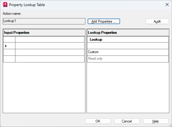 Displays the custom value assigned to the input properties. Click the bottom of a lookup column to make the lookup property read-only or to allow reverse lookup. Allow Reverse Lookup enables a drop-down list associated with the lookup grip that changes the block reference to match the input property values in the table.