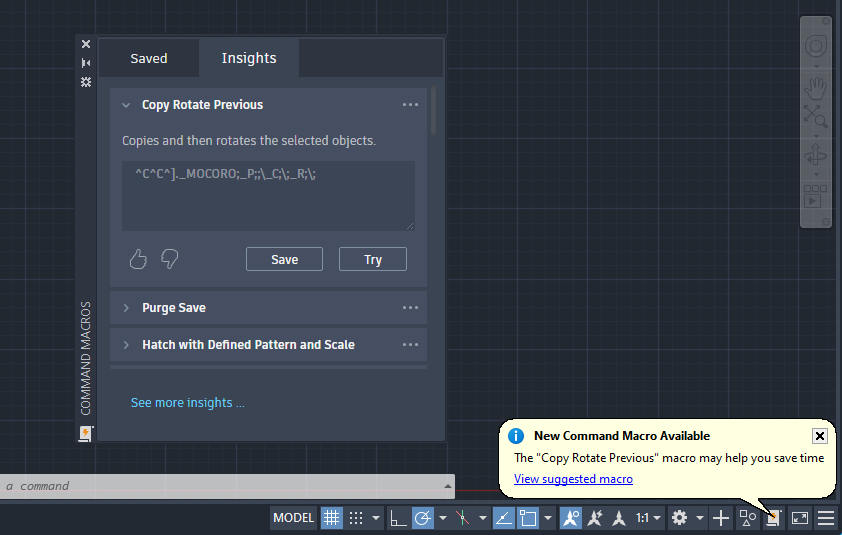 Initially, from the Insights tab, you can try and evaluate a new command macro. Clicking Try starts the command macro, based on the command macro, you might be prompted to provide input, such as specifying a point or selecting objects. If you find the command macro beneficial, you will want to save it so it can be ran or edited later from the Saved tab. Once saved, you can run a command macro by clicking its associated button associated.