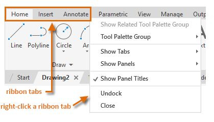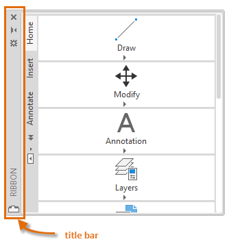 - Click the title bar and drag the undocked ribbon to either the left edge, right edge, or top of the drawing area
