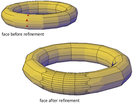 You can refine an entire mesh object as shown in the previous illustration, or select a specific face to refine. A refined face is subdivided into four faces and the surrounding faces are deformed slightly to accommodate the change.