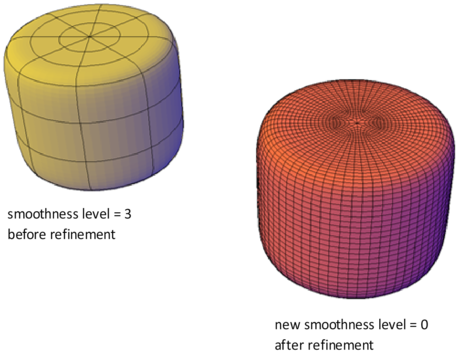 In addition to increasing the number of faces, refining a mesh object resets its level of smoothness back to the baseline. Therefore, an object might appear to be smoothed, but its smoothness level can still equal 0 (zero).