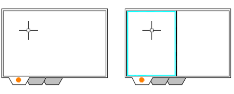 In the Model tab example below on the left, the current view is the entire drawing area. The example on the right displays two model space viewports, one of which is highlighted as the current viewport. You can click within a viewport to make it the current one, and you can then pan and zoom the view displayed in it.