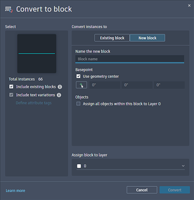 You can also convert the source object or the selected instances to a new block. In the Convert dialog box, define a new block by specifying a block name and insertion point. By default, the insertion point is set to the center of the selected geometry.