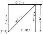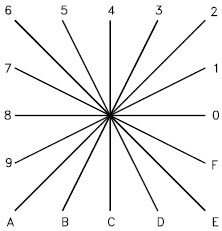 Each vector length and direction code is a string of three characters. The first character must be a 0, which indicates to the program that the next two characters are interpreted as hexadecimal values. The second character specifies the length of the vector in units. Valid hexadecimal values range from 1 (one unit long) through F (15 units long). The third character specifies the direction of the vector. The following figure illustrates the direction codes.