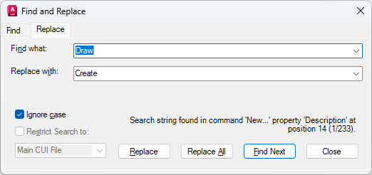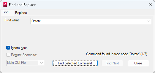 A message is displayed that details the location of the command; its exact position in the Customizations In or Properties pane, and the number of instances of the command.