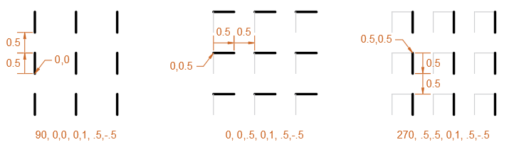 Hatch patterns defined using multiple definition lines describe the length and angle in which each line segment is to be drawn. The following shows the definition lines that describe the AR-B816 hatch pattern: