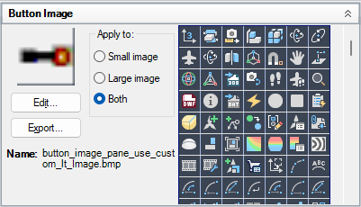 In the Button Image pane, under Apply To, select one of the three image assignment options; Small Image, Large Image, or Both. Then select the image you imported from the image list.