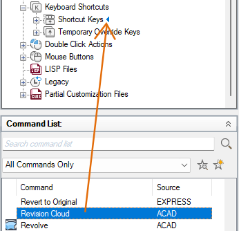 - To create a shortcut key, in the Command List pane, drag a command to the Shortcut Keys node in the Customizations In