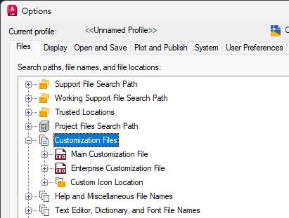 In the Options dialog box, Files tab, click the plus sign (+) next to the Customization Files node to expand it.
