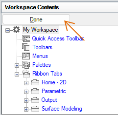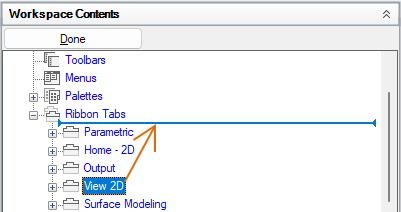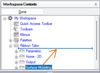 - In the Workspace Contents pane, click the plus sign (+) next to the Ribbon Tabs node to expand it.