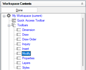 - In the Workspace Contents pane, click the plus sign (+) next to the Toolbars node to expand it.