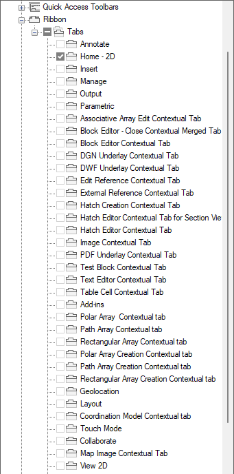 Use the CUI Editor to control the display of the Quick Access toolbar, ribbon tabs and panels, tool palettes, toolbars, and pull-down menus.