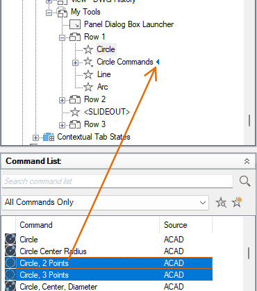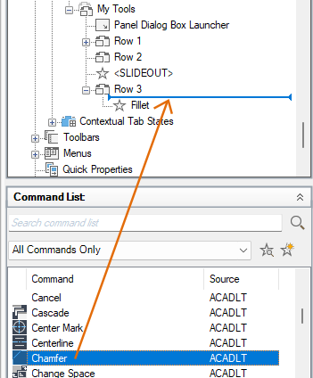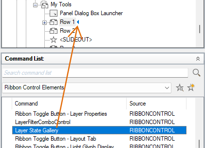 - Drag and drop a control from the Command list to a row in the ribbon panel.