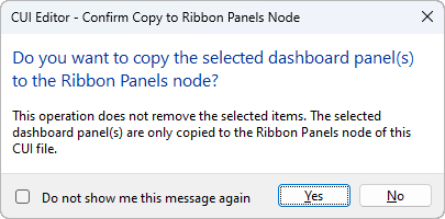 - In the CUI Editor - Confirm Copy to Ribbon Panels Node dialog box, click Yes.