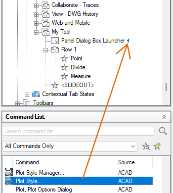 - Drag a command from the Command list to Panel Dialog Box Launcher on the panel.
