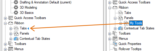 <file name> pane on the right side to the Panels node of a loaded CUIx file in the Customizations In