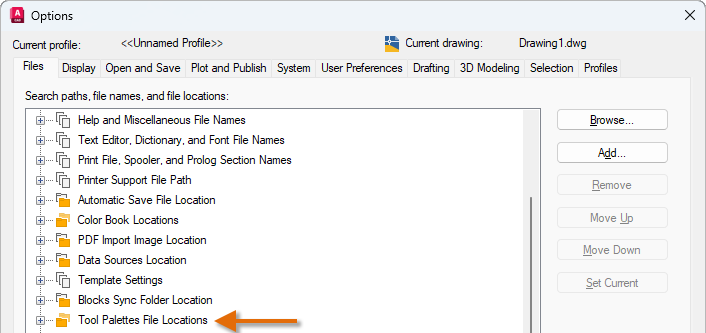 Tool palette files contain standard and user-defined tools. The files are stored in the locations specified by the Tool Palettes File Locations setting.
