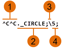 Here is what it looks like to start the CIRCLE command and draw a circle with a radius of 5 at the AutoCAD Command prompt and how that same input looks as a command macro string: