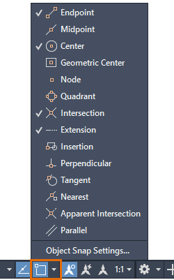 3. Click on the arrow, or right-click anywhere on the Object Snap icon, to display the associated menu.