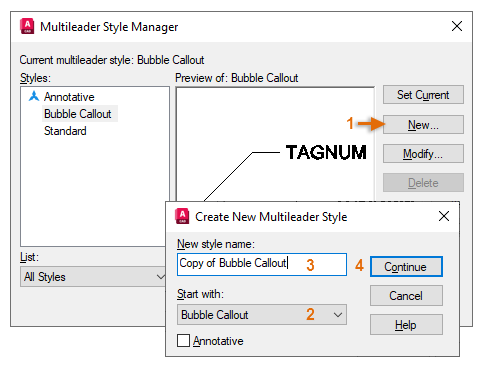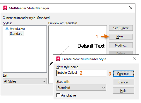 2. In the Multileader Style Manager, click New (1), type Bubble Callout as the new style name (2), and click Continue (3).