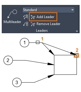 2. Click the Add Leader tool and select the top multileader (1). Specify another point on the rectangle (2).