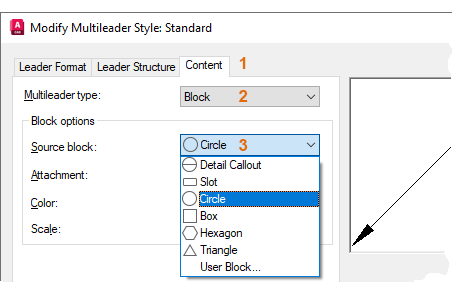 3. Next, click the Content tab (1), change the multileader type from Mtext to Block (2). For the Source Block, choose Circle (3). Then click OK.