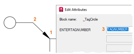 4. Using the Endpoint object snap, click a corner of the rectangle to specify the arrowhead location (1). Then click a location for the leader landing (2), type a letter or numeral in the Edit Attributes dialog box (3), and click OK.