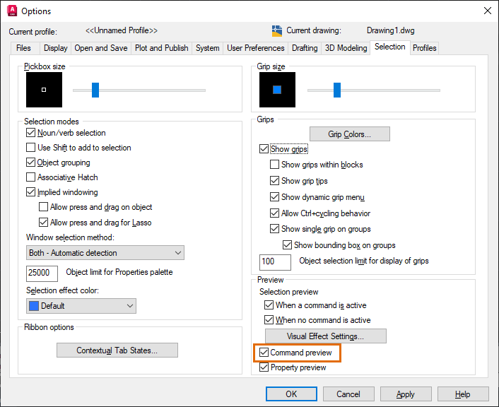 | COMMANDPREVIEW | Controls whether a preview of the possible outcome of certain commands is displayed. | 1 | Registry |