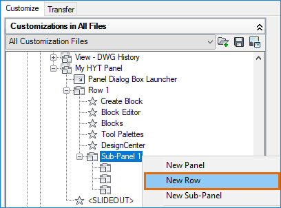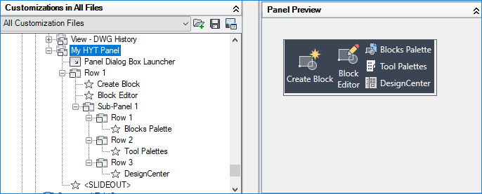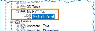 In the CUI Editor, locate the newly created ribbon panel (My HYT Panel), if necessary.