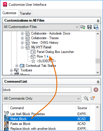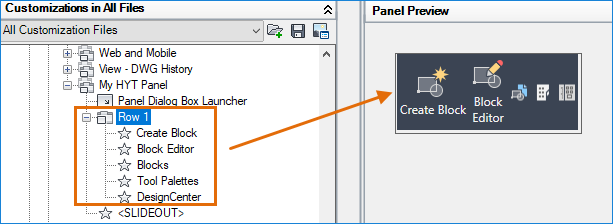 In this exercise, you’ll add five block-related commands to the ribbon panel you just added, My HYT Panel.