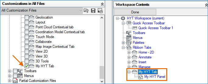 The My HYT Tab is added to the Ribbon Tabs node in the Workspace Contents pane.
