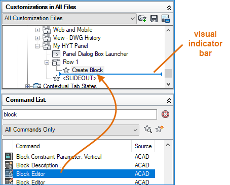 Using the ‘block’ search result, select Block Editor (BEDIT command) and drag it to Row 1 under Create Block. Use the visual indicator bar to specify the position of the command.