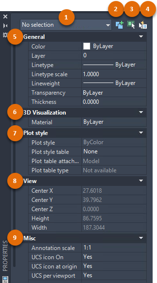 | 5 | General | Displays the general properties of the selected object or the settings of the current drawing (when nothing is selected). This section also includes a set of Layer tools. |