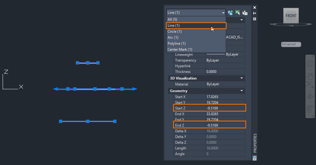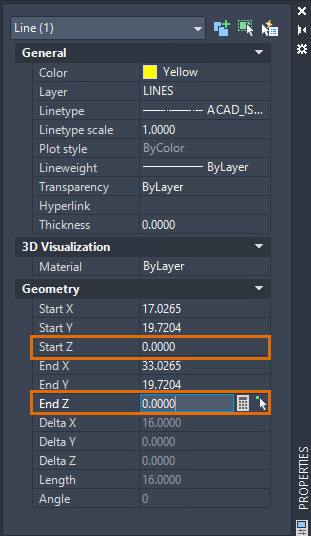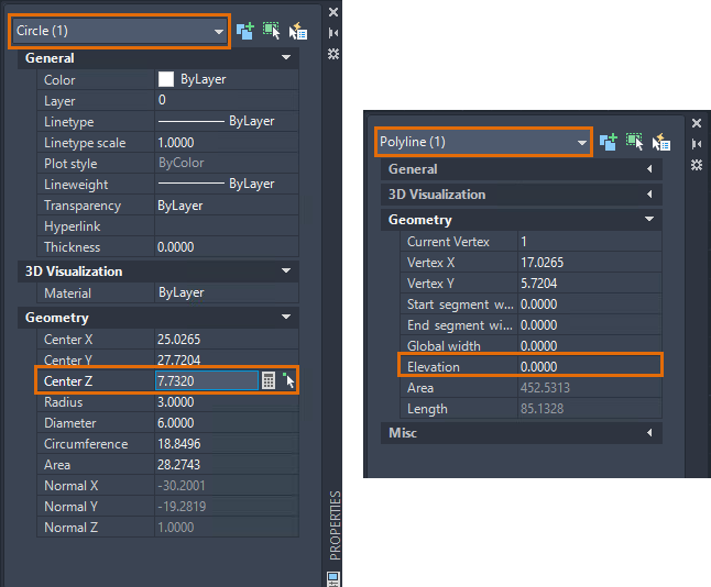 Different objects will have different Z-axis property names. An object may have one or a combination of the following properties: Start Z, End Z, Position Z (mtext), Center Z (circles), or Elevation (polylines).