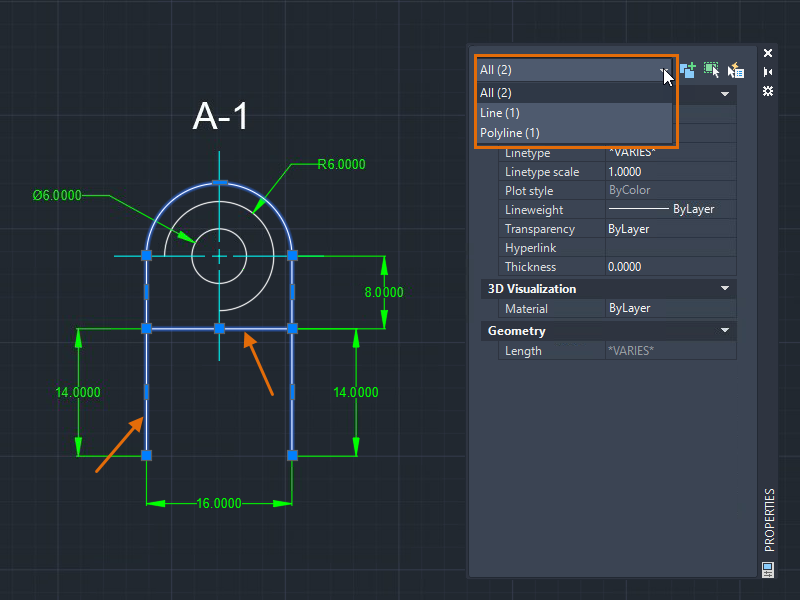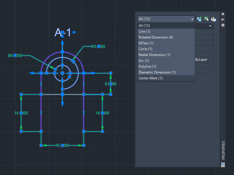 Sometimes, we need a quick and simple way to filter objects. The Properties palette allows you to filter objects and apply changes to the selected objects by type.