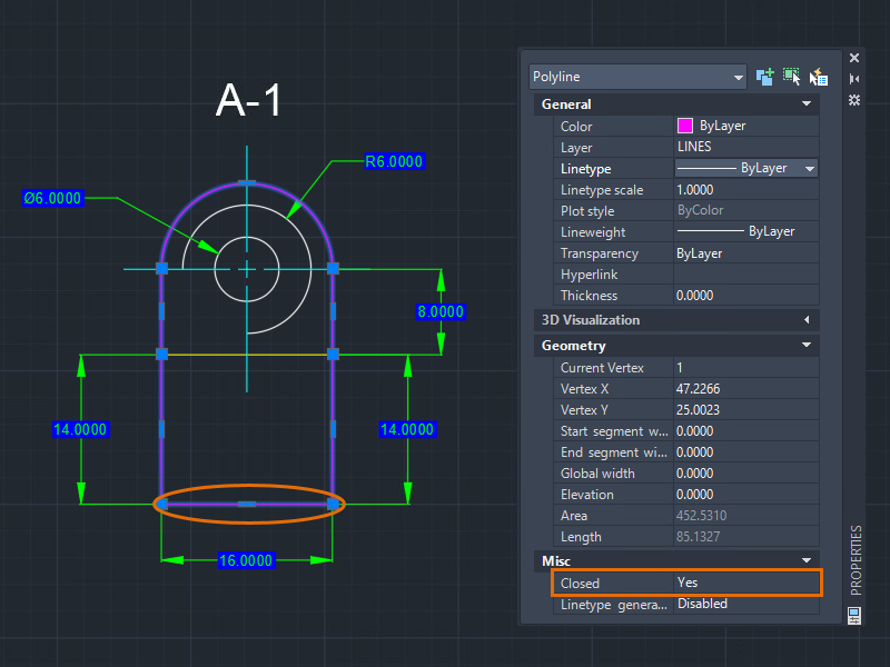 When you close the polyline, a line segment is created from the last vertex of the polyline to the first vertex. Closing the polyline using this method does not add a vertex to the object.