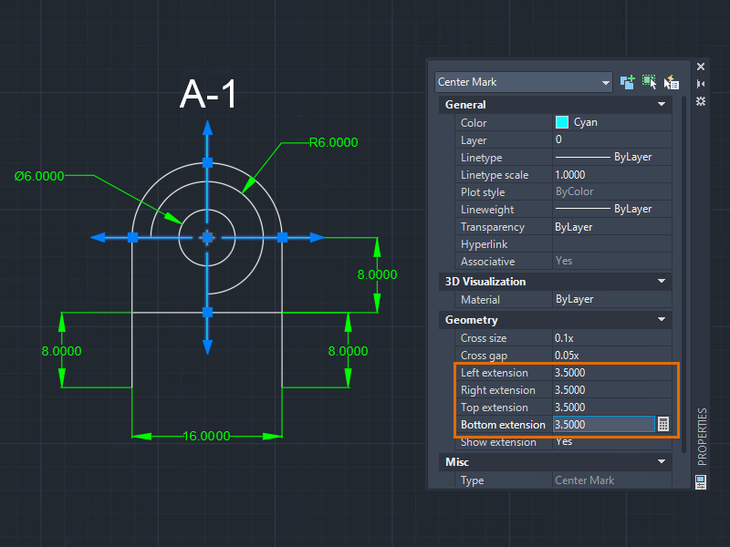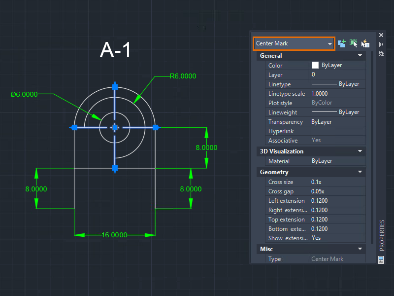 The properties of the selected center mark display in the Properties palette.
