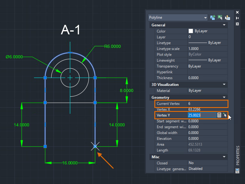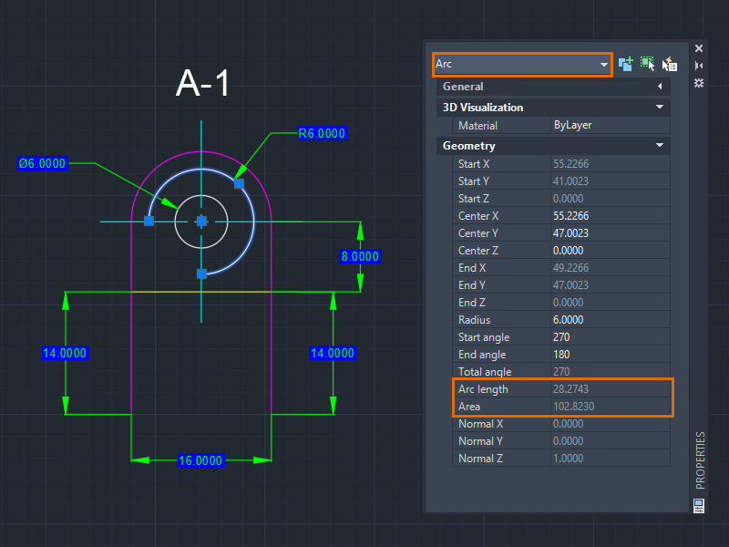 Obtaining geometric information can be done in many ways, for example, using dimensioning tools. But depending on the situation or complexity of the geometry, you might find it easier to view the properties of an object and then change the values in the Properties palette.