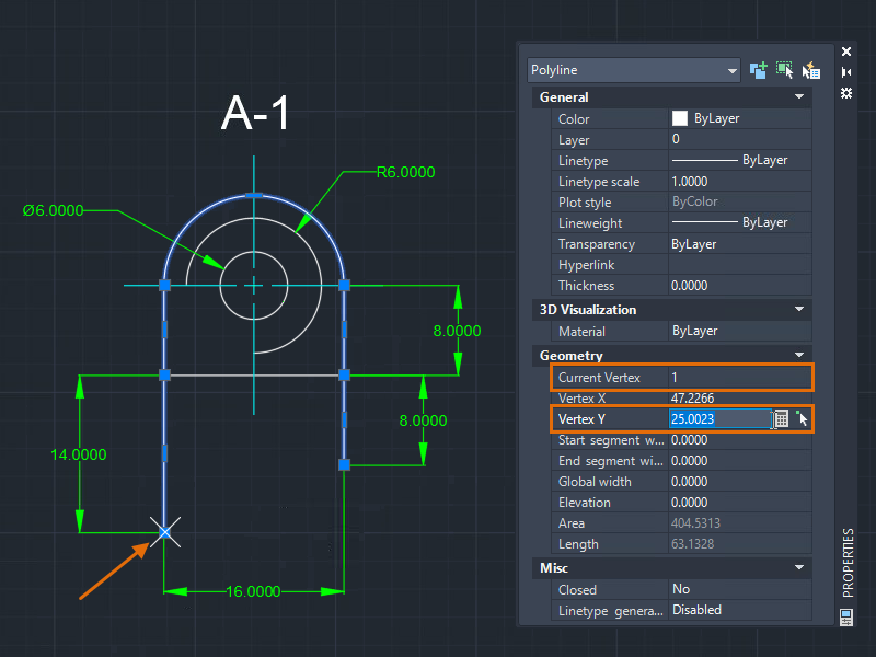 Now, the first and last vertices of the polyline are aligned. This method of editing the vertices is useful when you know the absolute coordinates you want.