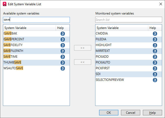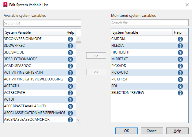 On the left are all the system variables available to monitor. On the right are the system variables already being monitored. Click the ? next to a system variable name to open its associated Help topic.