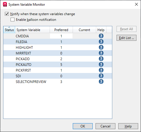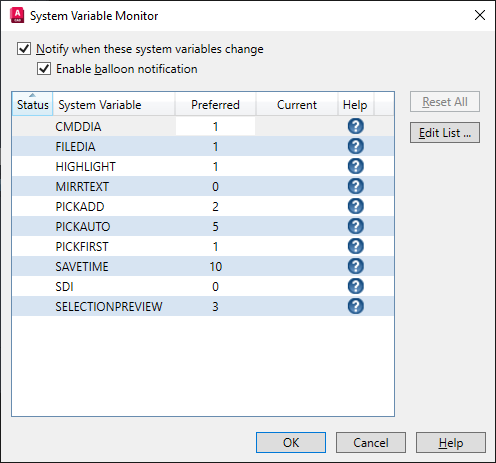 At the Command prompt, enter SYSVARMONITOR. In the System Variable Monitor dialog box, you can see the system variables that are currently being monitored.