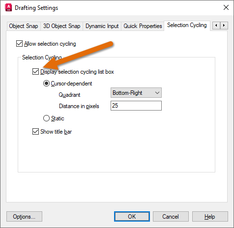 There are a few other settings on the Selection Cycling tab that control the display of the selection cycling list box. More information can be found in the Selection Cycling Tab (Drafting Settings Dialog Box) topic in help.