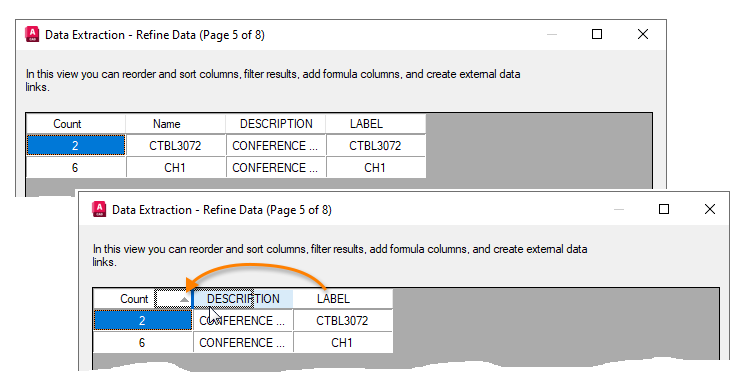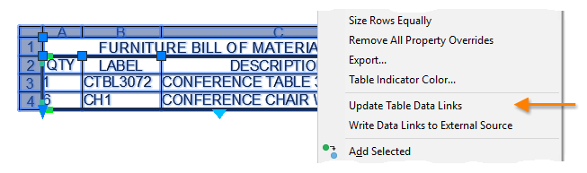 Data extracted and placed in a table can be updated using the original extracted data settings. For example, if you were to add additional blocks to a drawing and you could update the data link associated with a table to include the latest block counts instead of having to repeat the extraction process.